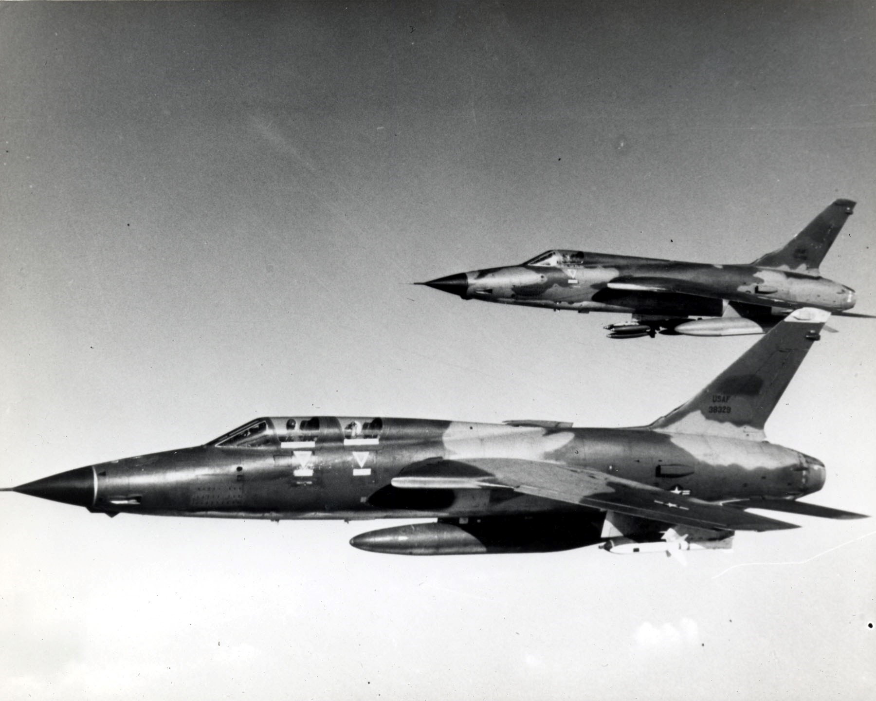 Figure 1: An F-105 Hunter-killer team in Vietnam. In the foreground is the two-seat F-100F Wild Weasel variant of the Thunderchief, with a F-105D single-seater in the background. The Wild Weasel mission focused on the destruction of enemy radars and was often flown in mixed teams (U.S. Air Force photo)