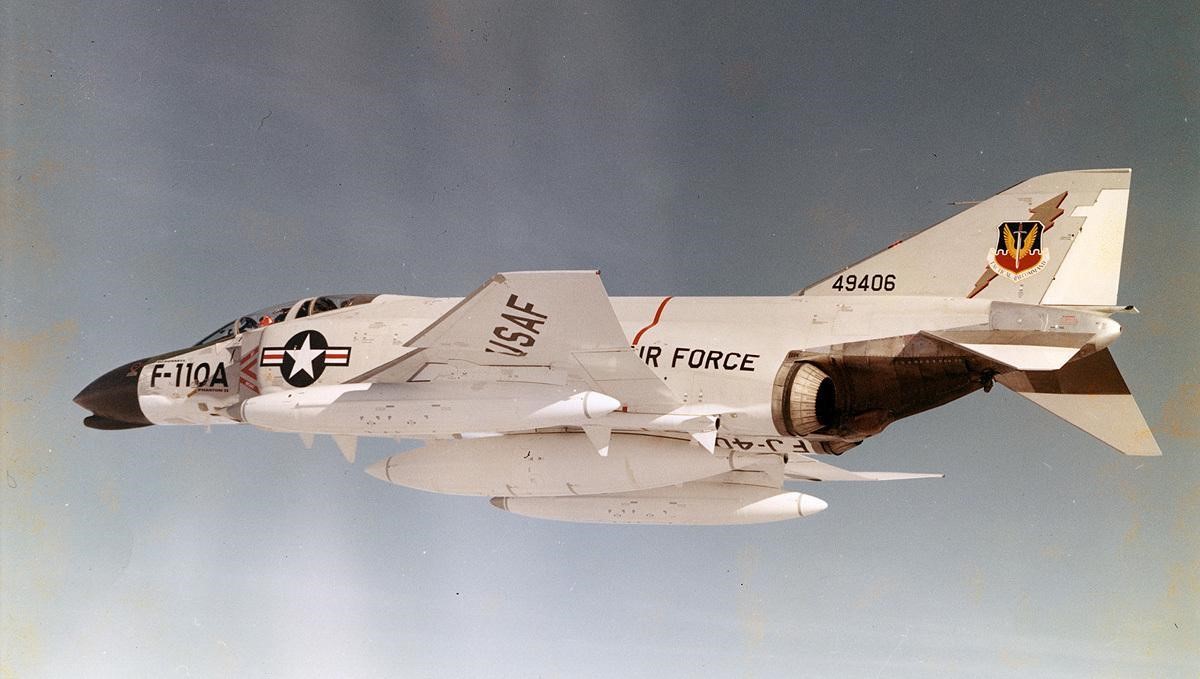 Figure 6: Postscript. The Air Force borrowed two Navy F-4Bs for evaluation, repainting them and giving them the short-lived designation of F-110A. Pictured is one of those aircraft, painted in Tactical Air Command livery but still sporting its Navy bureau number on the tail and the Navy FJ-4U designation under the right engine. The F-4 is still in service internationally more than 50 years after its maiden flight. (U.S. Air Force photo)