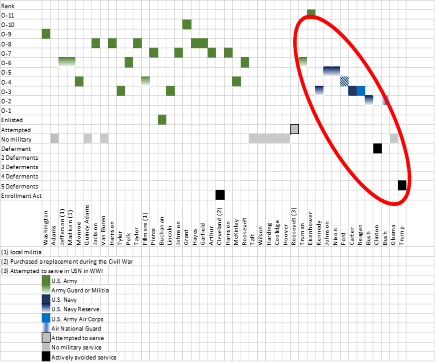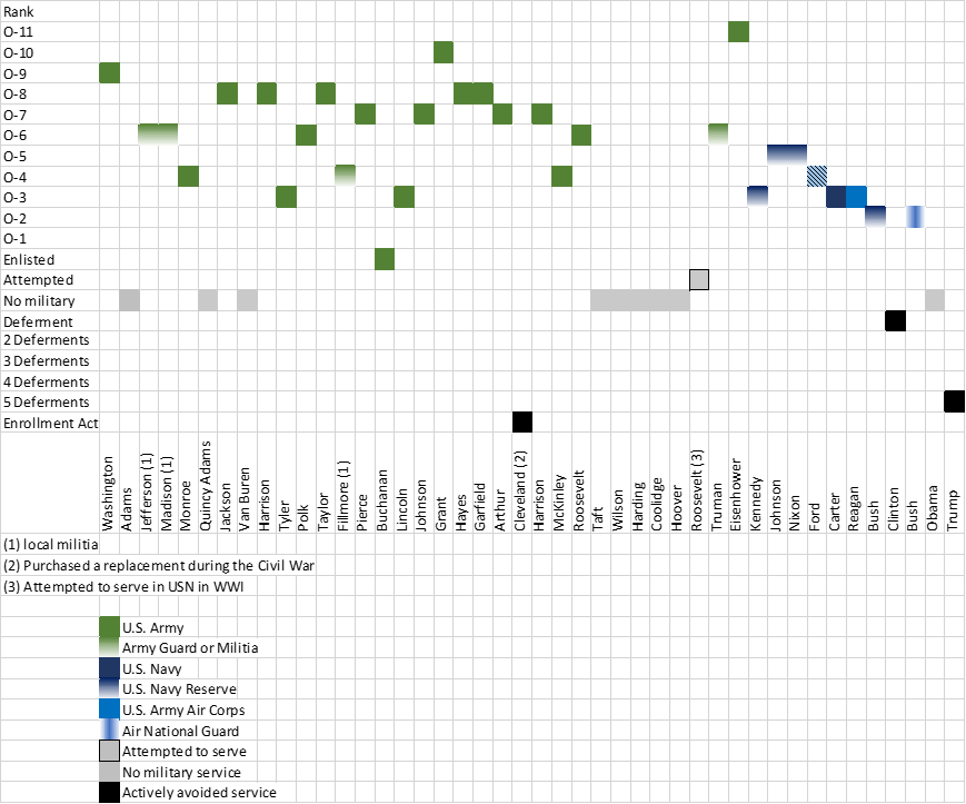 This article is a simple, non-academic representation of a history of presidential military service. It neither breaks new ground nor proposes recommendations based on lengthy analysis. For authoritative academic work on this topic, consult the work of Peter Feaver at Duke University and others. Instead, the graphs below offer a window into American presidents’ military service. They also suggest possible ramifications for the 2020 election and beyond because fewer presidents in the past thirty years have served in the military and, those that did were junior in rank. For example, do voters care about military service in their candidates? Why were most of the post-World War II presidents those with Navy experience, especially as junior officers, when the Navy was only about a third of the size of the Army during the war years? And why have only generals been president but no Navy admirals?