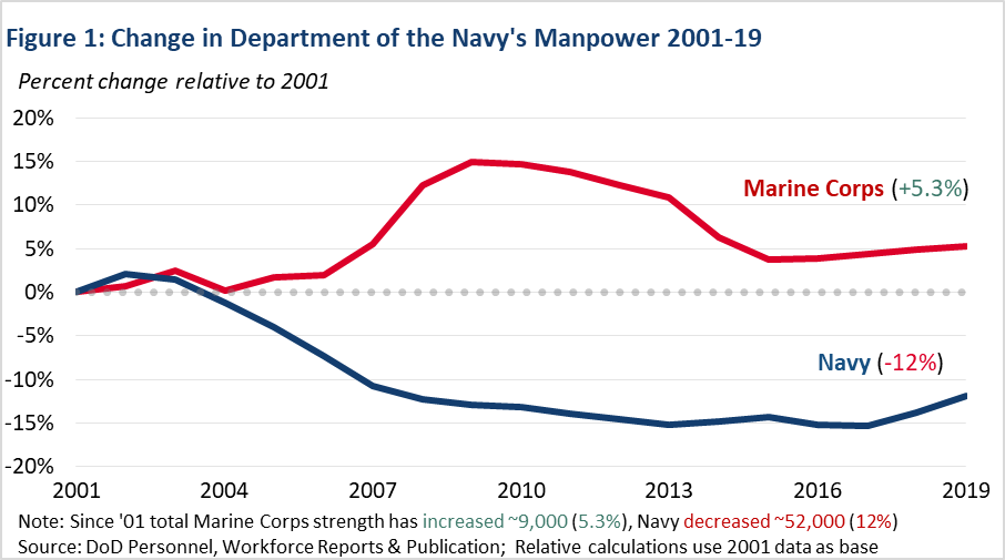 It is now time to put marines back on vessels. Marines should practice maneuver warfare in complex environments, confined to shallow water. Naval integration means committing to what marines can do to help the naval commander fight his fleet. Given the Navy’s loss of 12 percent of its manpower since 2001 in comparison to the Corps growing slightly over the same period (see Figure 1), perhaps the best way for marines to help the Navy is to fully embrace and extend the littoral mission that Jake Yeager describes to the blue waters. However, the Navy currently lacks the resources to sufficiently execute. Looking at the commandant’s overinvestment list, maybe short-term acquisition efforts should be directed toward capabilities such as littoral combat ships (Mark VI or Combat Boat 90s) that can augment Littoral Combat Groups (LCG) instead of longer-term technological innovation efforts like unmanned vessels.