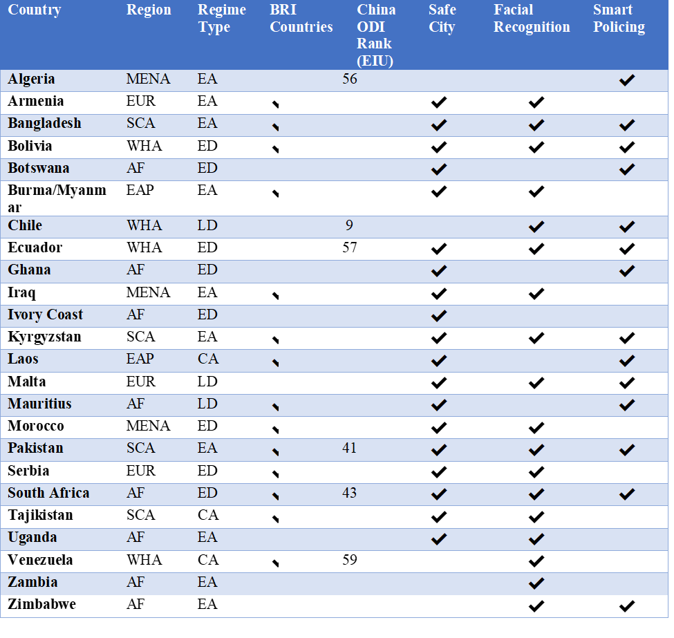 This raises an important follow-on question — in how many countries is China the main provider of AI surveillance for public security? Using data collected in the Carnegie report, I found that in 24 countries worldwide, Chinese firms appear to be the primary suppliers of AI surveillance technology to their respective governments. The appendix presents the full list of countries.
