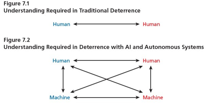 Consider a RAND Corporation wargame examining how thinking machines affect deterrence. In this report, moves made by one side that both human players perceived as de-escalatory were immediately perceived by AI as a threat. When a human player withdrew forces to de-escalate, machines were likely to perceive a tactical advantage to be pursued; when a human player moved forces forward in an obvious (but not hostile) show of determination, machines tended to perceive an imminent threat and engaged. The report found that humans had to contend with confusion not only over what the adversary human was thinking, but with the adversary AI’s perception as well. Furthermore, players had to contend with how their own AI might misinterpret human intentions (whether friendly or enemy). A graphical depiction from the report illustrates just how much this complicates deterrence: