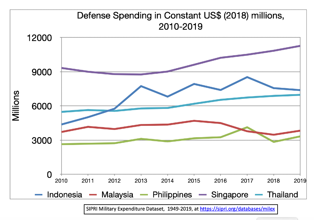 According to the Stockholm International peace Research Institute (SIPRI), Southeast Asia spent $34.5 billion on defense in 2019, a 4.2 percent increase from 2018. But SIPRI’s 2019 numbers don’t include full data for Myanmar or Vietnam, which adds at least $8 billion. Singapore topped regional defense spending at $11.2 billion, followed by Indonesia ($7.7 billion), Thailand ($7.3 billion), Malaysia ($3.8 billion), and the Philippines ($3.5 billion).