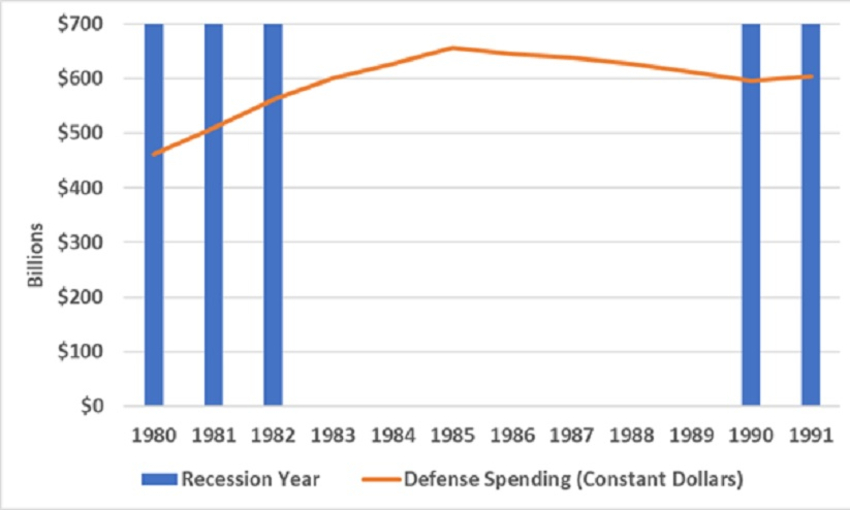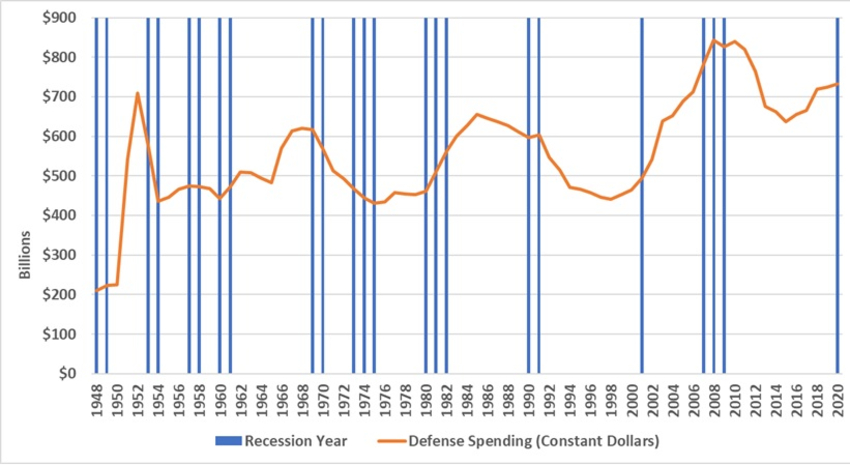 Source: Chart generated by the author. Data from the National Bureau of Economic Research and Office of the Under Secretary of Defense (Controller).