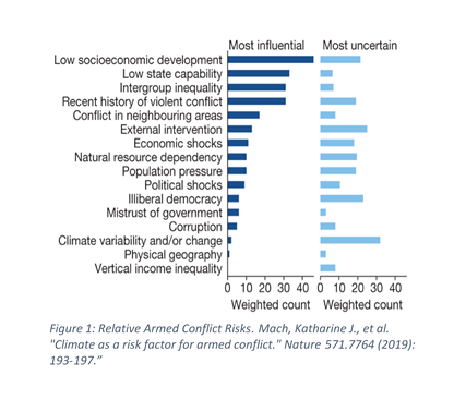 However, the most common characterization of climate-conflict risk in policy discussions is as a “threat multiplier,” exacerbating existing drivers of conflict like poverty, low state capacity, intergroup inequalities, and economic shocks. That is, climate change may exert direct effects on conflict, but likely exerts even larger indirect effects operating through other known drivers.