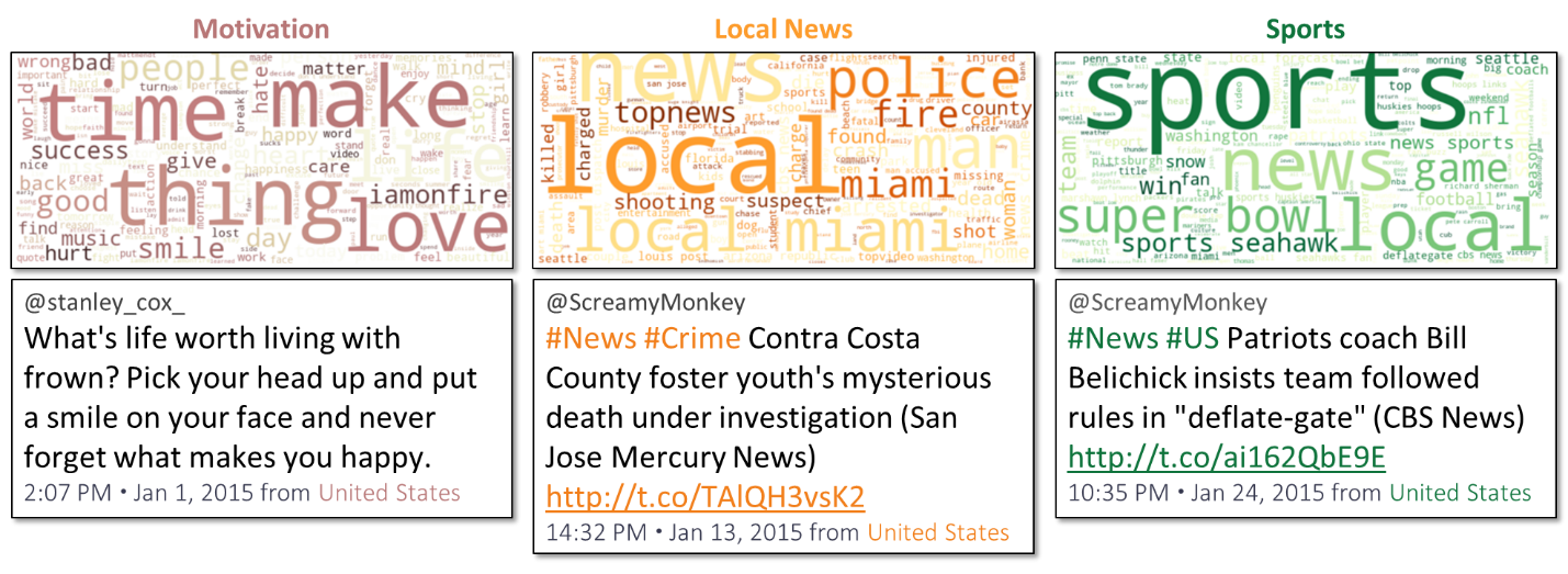 Figure 2: Three Internet Research Agency Topics With Representative Tweets, January 2015.