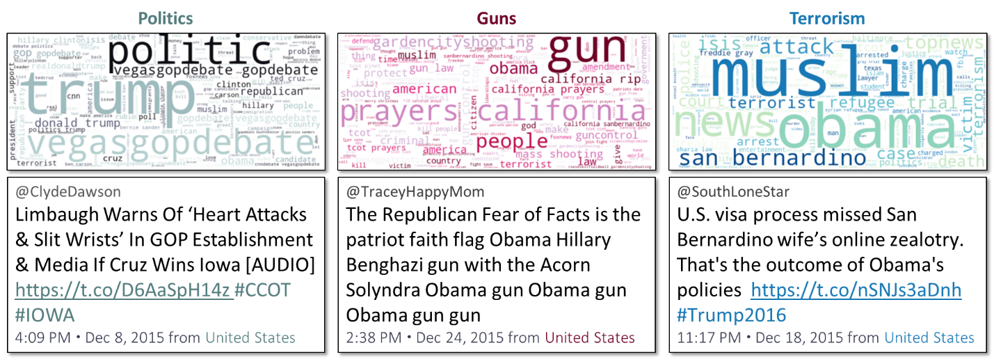 Figure 4: Three Internet Research Agency Topics with Representative Tweets, December 2015.