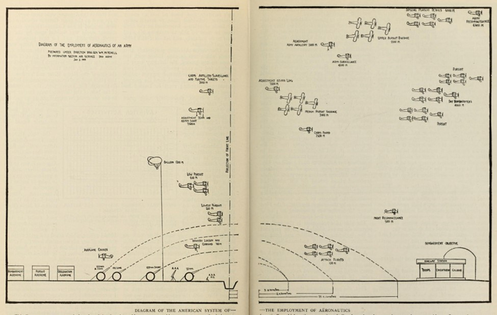 Yet had the school remained solely focused on support at the expense of independent options it would not have properly prepared for World War II. Getting an appropriate balance between supporting missions and independent ones was not easy, especially as Mitchell and others called for independence. The image below, which accompanied an article Mitchell wrote shortly after the war, suggests his focus at this point in August 1919 remained largely on the battlefield. Even the “bombardment” objectives are very tactical in focus, as evidenced by their location at the bottom right corner located at the bottom right corner very close to the battlefield.