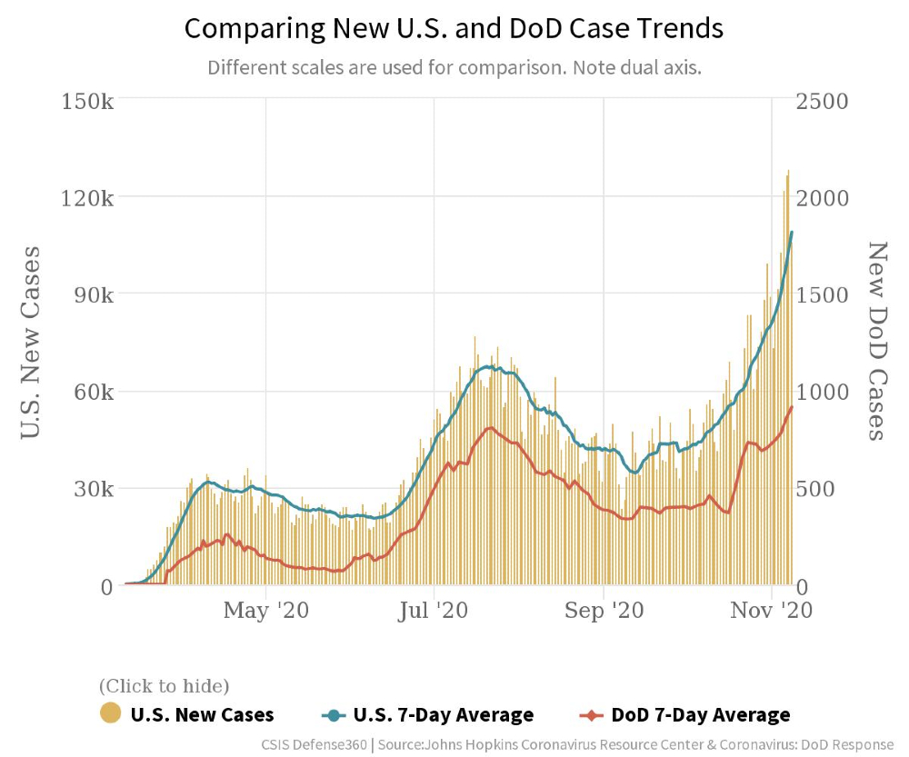 The U.S. military, like the rest of the United States, has so far experienced two major waves of new infections and the beginnings of a third. The first wave peaked in mid-April at roughly 250 new Department of Defense cases a day before declining in May. The second much larger wave peaked in mid-July at around 800 new cases a day. New cases steadily declined from the second wave peak and bottomed out in mid-September. They have recently begun to rise again, constituting a third wave. The chart below on new military cases of COVID-19 shows these waves.