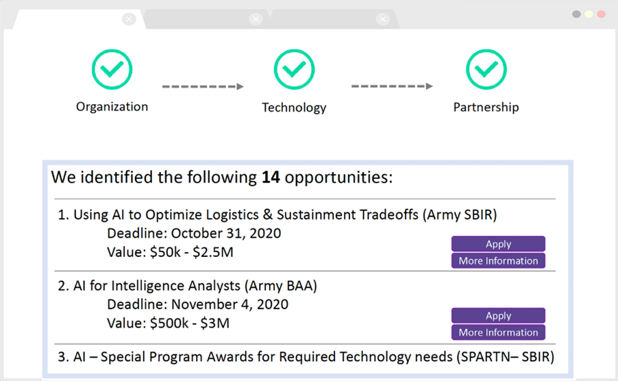 Companies struggle with the wide array of disparate platforms the Army uses to advertise opportunities (e.g., grants.gov, BetaSAM, SPARTN, Vulcan, Office of Small Business Programs). Firms miss pertinent opportunities because they are unaware of which platform to use, or fail to successfully leverage these sites because of non-user-friendly interfaces. To illustrate, a battery technology company could find solicitations related to new power sources on at least seven different Army websites. The company would need to properly filter over 300 Army search results on BetaSAM for a term like “wearable battery” to understand relevance and eligibility.
