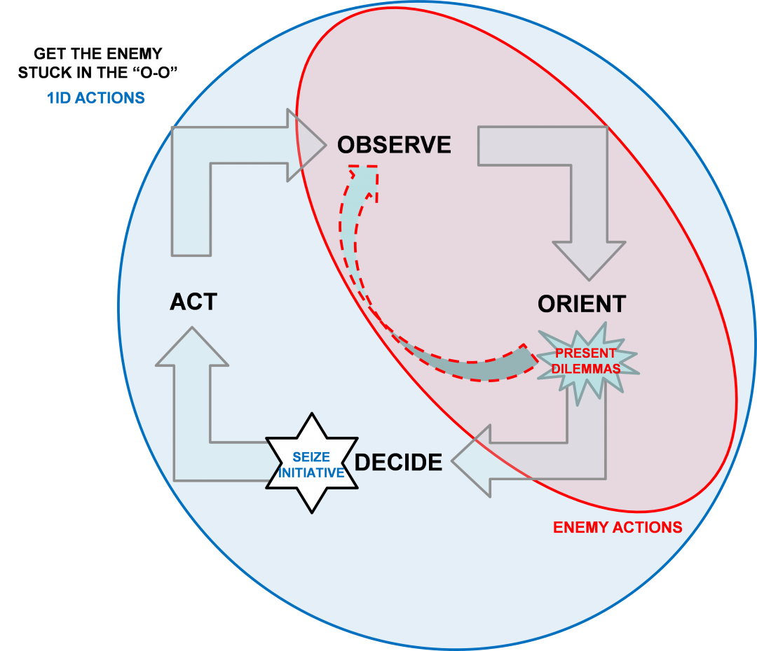 In practice, portions of the U.S. military have begun seeking to apply these ideas to multi-domain warfare. Some of these efforts seek to get the enemy stuck between the “observe” and the “orient” phases of John Boyd’s well-loved “Observe–Orient–Decide–Act” loop through faster reaction cycles. As seen in the below graphic that accompanied a 2019 article analyzing a command post exercise, an Army unit sought to “present dilemmas” at the orient phase, thereby forcing the opponent back to the observation phase, effectively paralyzing its ability to respond.