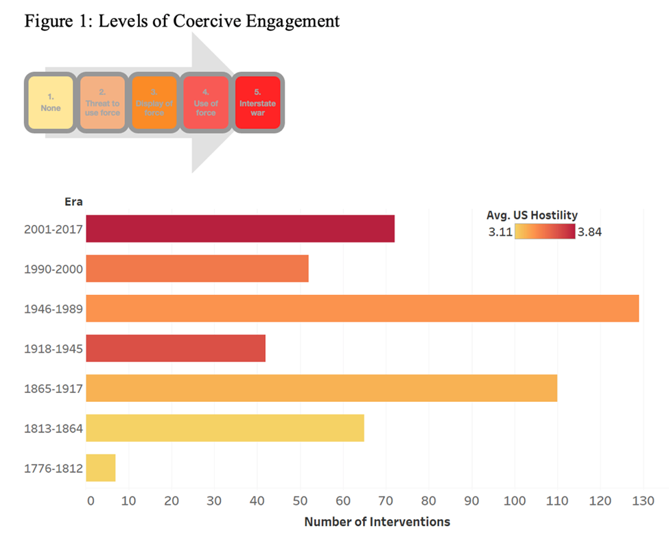 Of course, Powell’s effort to dissuade the United States from intervention in future small wars was not successful. Since the end of the Cold War, and in particular since 9/11, the United States has increasingly undertaken the first sort of intervention: deployments to war-prone territories that feature fractured polities and instability, often the conditions that are claimed to necessitate military intervention in the first place. Using data from the Military Intervention Project I direct at the Fletcher School, Tufts University, Figure 1 outlines the number of U.S. coercive engagements across different historical eras (e.g., the Cold War) and the physical intensity — labeled as “level of hostility” — of those interventions: from no use of force, to threat of force, to the use of force below the threshold of outright war, to, finally, interstate war.