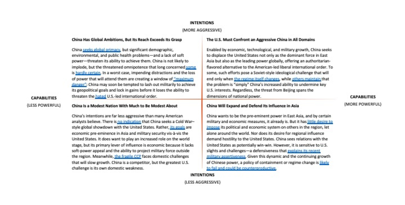 So, we began with a perspective-taking exercise. Setting aside our own beliefs about China, we interviewed 15 experts on U.S.-Chinese relations and canvassed the research and writing of many more. Although there are certainly other ways to capture the universe of perspectives on bilateral ties, our exploratory work suggested that the best approach was to construct a 2×2 matrix oriented around the classic variables of intentions and capabilities. This allowed us to distill a wide swath of opinion into four schools, which we did — first into 800-word essays and then into 80-word gists of those essays. This exercise was useful in and of itself, mapping perspectives and disaggregating differences, while also identifying points of agreement.