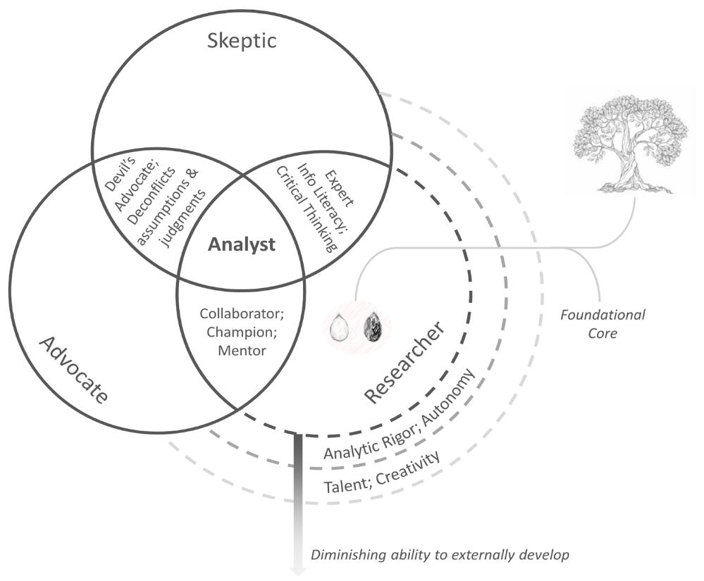 An Air Force intelligence analyst is not a single job. In fact, it is a knowledge worker at the intersection of three roles: advocate, skeptic, researcher (see Figure 4). By considering an analyst as the intersection of these roles, one may better understand how analysts embody the traits of each during their mission. The skeptic doubts the truth or value of both intrinsic (held by themselves) or extrinsic (held by an external person or group) beliefs and requires both intrinsic and extrinsic beliefs be held at risk until validated by evidence. The advocate relies on cogent argumentation to defend or maintain a theory, proposal, or policy and is proactive, advancing their own requirements and supporting the requirements of others.