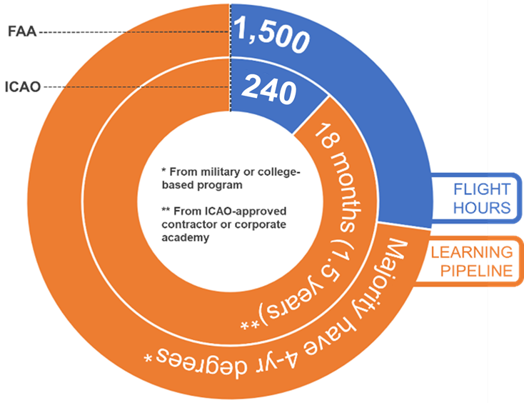 Figure 1: Informal comparison of International Commercial Aviation Organization versus Federal Aviation Administration co-pilot (first officer) certification standards in 2021.