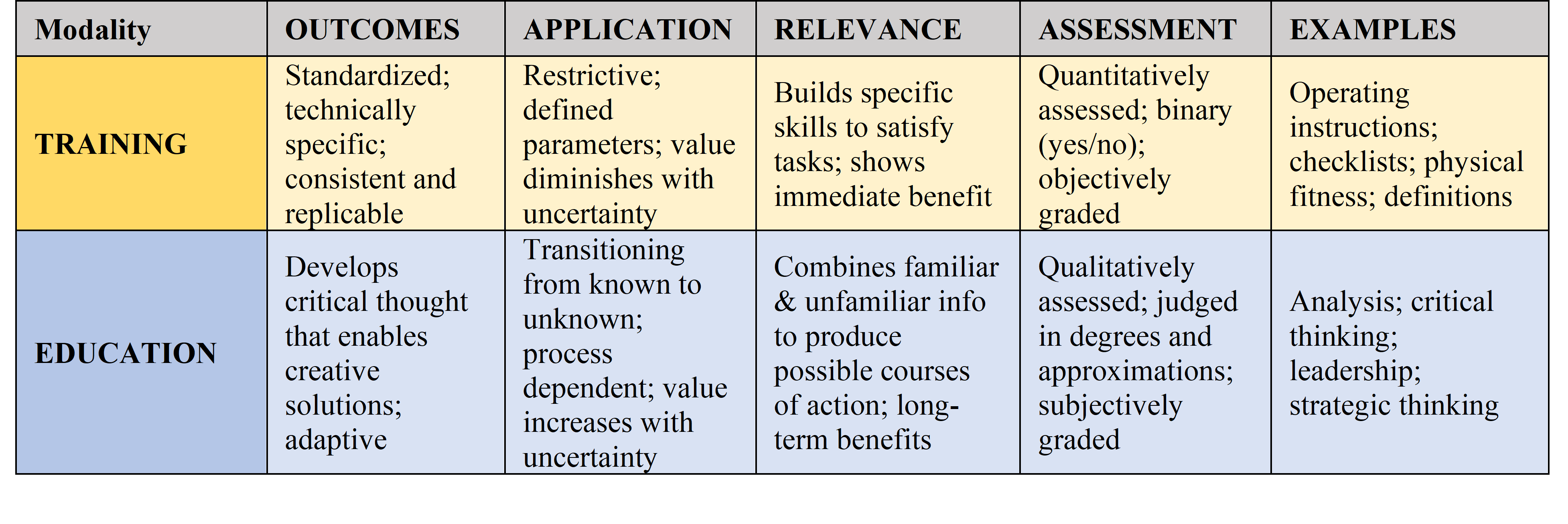 As a teacher, curriculum developer, and analytic practitioner in the Air Force, these definitions are prudent and effective. In my experience, describing the specific learning modality being used helps students mentally orient themselves. If students are expecting the consistency and certainty of training while being educated, they are likely to become easily frustrated and confused, expecting clear answers, not interpretive lenses and conceptual frameworks. Likewise, if students expect the interpretive nature and debate-driven form of education, they over-complicate and over-analyze training, making the process unnecessarily cumbersome.