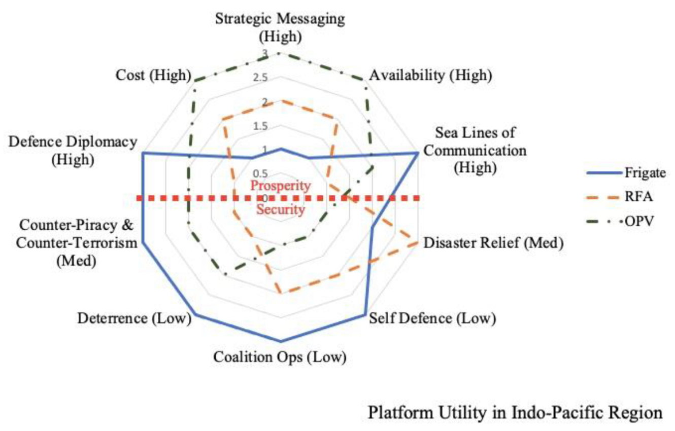 Drawn from personal experience, the diagram below depicts the essential tasking elements. The red dotted line delineates the prosperity versus security focus. It will come as no surprise that the frigate option is the most capable ship (largest area in the diagram), and this may explain their default status for overseas tasking. However, a frigate’s strategic messaging prioritizes security over prosperity, with the majority of the area falling below the red dotted line. The offshore patrol vessel comes in second due to its ability to deliver on routine tasking, its availability, cost, and the more aligned strategic messaging this ship delivers. The Royal Fleet Auxiliary’s amphibious capability, whilst very capable in the delivery of aid, favors security. Its availability is also questionable, and its status as a civilian support vessel may limit its effectiveness in delivering defense diplomacy.