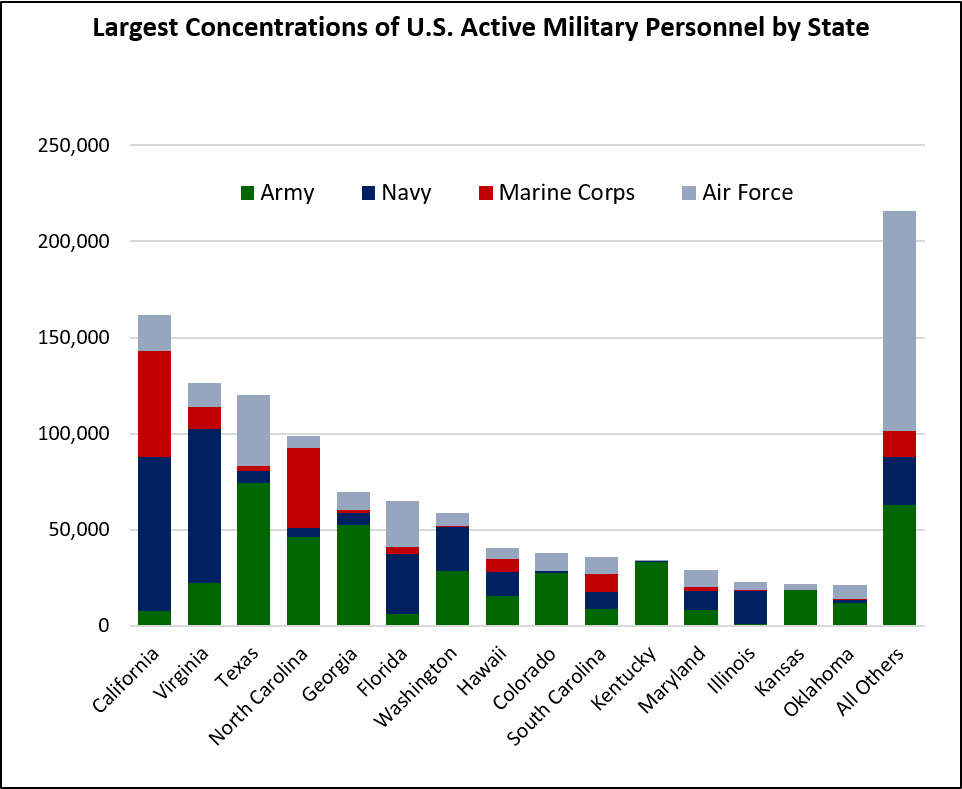 Source: Generated by author, based on data from Defense Manpower Data Center, March 2021. Space Force personnel are included in Air Force figures. Large concentrations of U.S. Air Force personnel are also based in New Mexico, Arizona, Nevada, and Alaska, among others. Large numbers of U.S. Army personnel are also based in New York state and Alaska, among others. Figures do not include U.S. military personnel based overseas (e.g., Germany, Japan, Kuwait, South Korea, etc.).