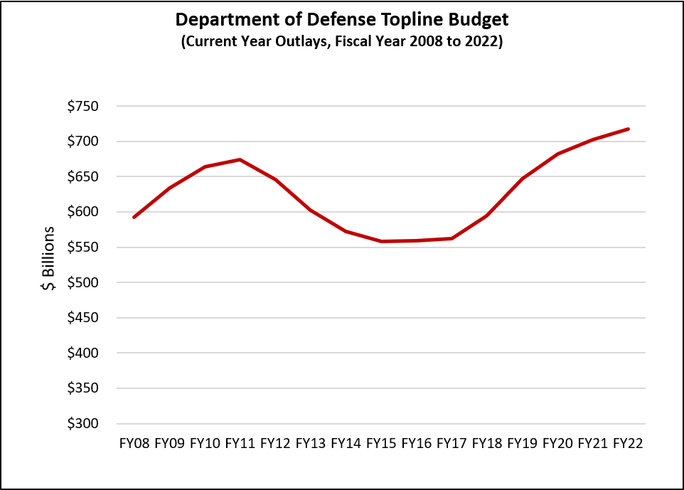 Source: Generated by author, based on data from the Office of Management and Budget, FY22 President’s Budget. Figures are shown in outlays. FY2015 represented the most recent low point in the cyclical ebb and flow of the Defense Department budget, influenced both by the wind-down of operations in Iraq and Afghanistan and the impact of discretionary spending caps imposed by the 2011 Budget Control Act.
