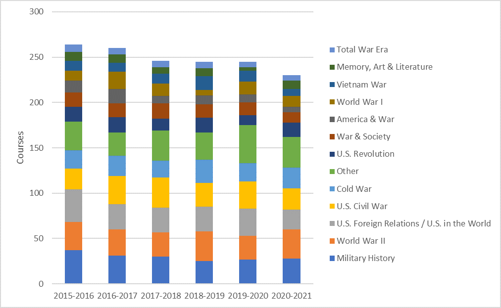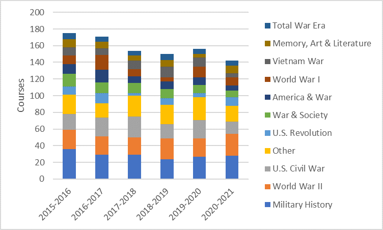 Hastings is a great military historian, but the portrait he paints in his article is inaccurate. Whatever the cause of the decline in history majors, it is not due to a lack of classes on war-related themes. Indeed, the evidence we have collected shows the enduring presence of courses on war in leading American history departments. Based on a detailed examination of course offerings over a six-year period, we conclude that the teaching of war and conflict is doing quite well in history departments across the United States. Furthermore, courses in the field are taught mostly by tenure-track faculty; they are taught at both the survey and advanced level; and even using a fairly narrow definition of what constitutes “war studies,” the subject matter covered is wide-ranging across the modern era. The American Revolutionary War, the U.S. Civil War, the two world wars, regional conflicts like the Vietnam War, and even the “Global War on Terror” all appear consistently in history department offerings across the country, as do courses in the general category of “military history.” Surely, those of us who work in the field would welcome even more course-offerings. But in no way have historians “declared war” on this field.