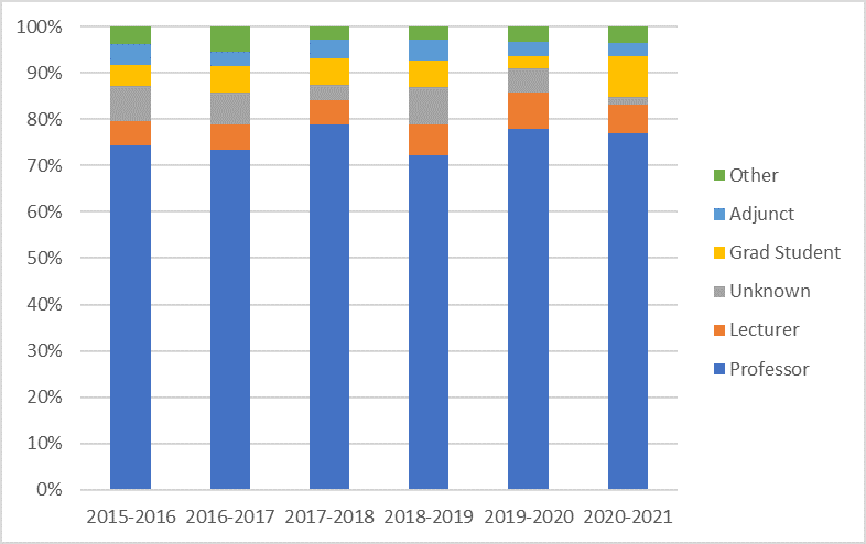 What about the faculty who teach in this field? One sign that universities do not value a given field might be an increase in courses taught by adjunct faculty or temporary lecturers. Again, the data tells a contrary story. Over the last six years, the percentage of classes in the field of war studies taught by tenure-track faculty has remained consistently high. Full-time tenure-track faculty taught 75 percent of the courses that deal with war. And that proportion has stayed fairly stable. In fact, a slightly higher percentage of these courses were taught by ladder faculty in the 2020–2021 academic year than in the 2015–2016 academic year.