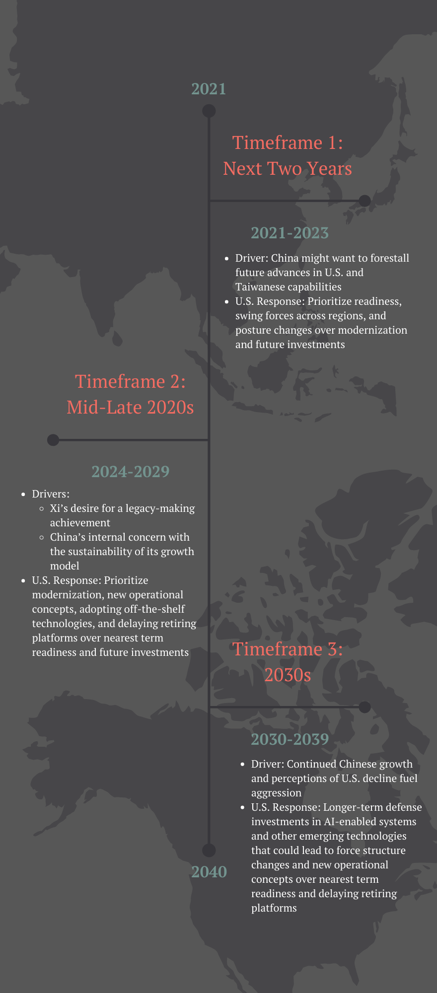 If war over Taiwan is imminent in the next two years, the United States should emphasize readiness and posture over modernization and future investments. If war is most likely later in the 2020s, new warfighting concepts, modernization, adapting off-the-shelf technologies, and delaying retiring some older platforms should become the priorities. If war is most likely in the 2030s or beyond, longer-term defense investments, such as AI-enabled systems that require bigger changes to force structure, combined with innovative operational concepts, should be prioritized.
