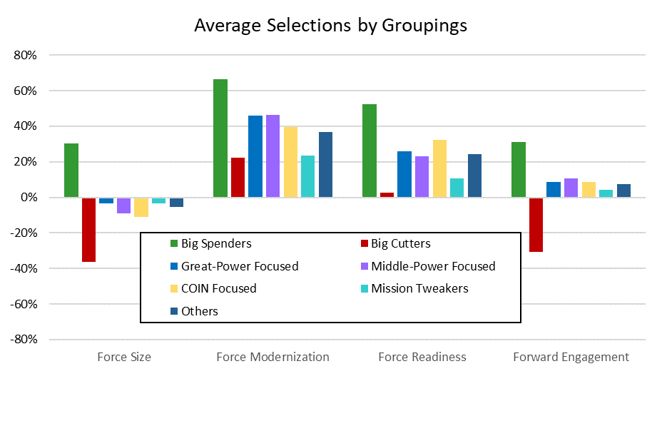 Finally, one in every 14 simulations made only minor increases or decreases to all of the missions while holding budgets relatively stable. This group tended to suggest the smallest increases in modernization, readiness, and forward engagement of everyone but the big cutters. They did, however, suggest spending an additional $19 billion on defense in the next five years.