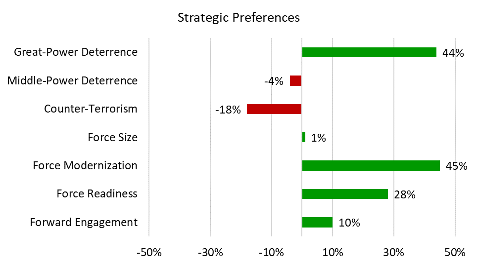 Overall, the users of the simulator have a clear desire for more focus on great-power deterrence and defense over either middle-power deterrence and defense or counter-terrorism and counter-insurgency operations. These preferences equate to a greater focus on China and Russia, which is logical given the recent U.S. withdrawal from Afghanistan and ongoing concerns about crisis scenarios involving Taiwan and Ukraine. This may also reflect user beliefs that the United States is overly focused on threats from Iran and North Korea.