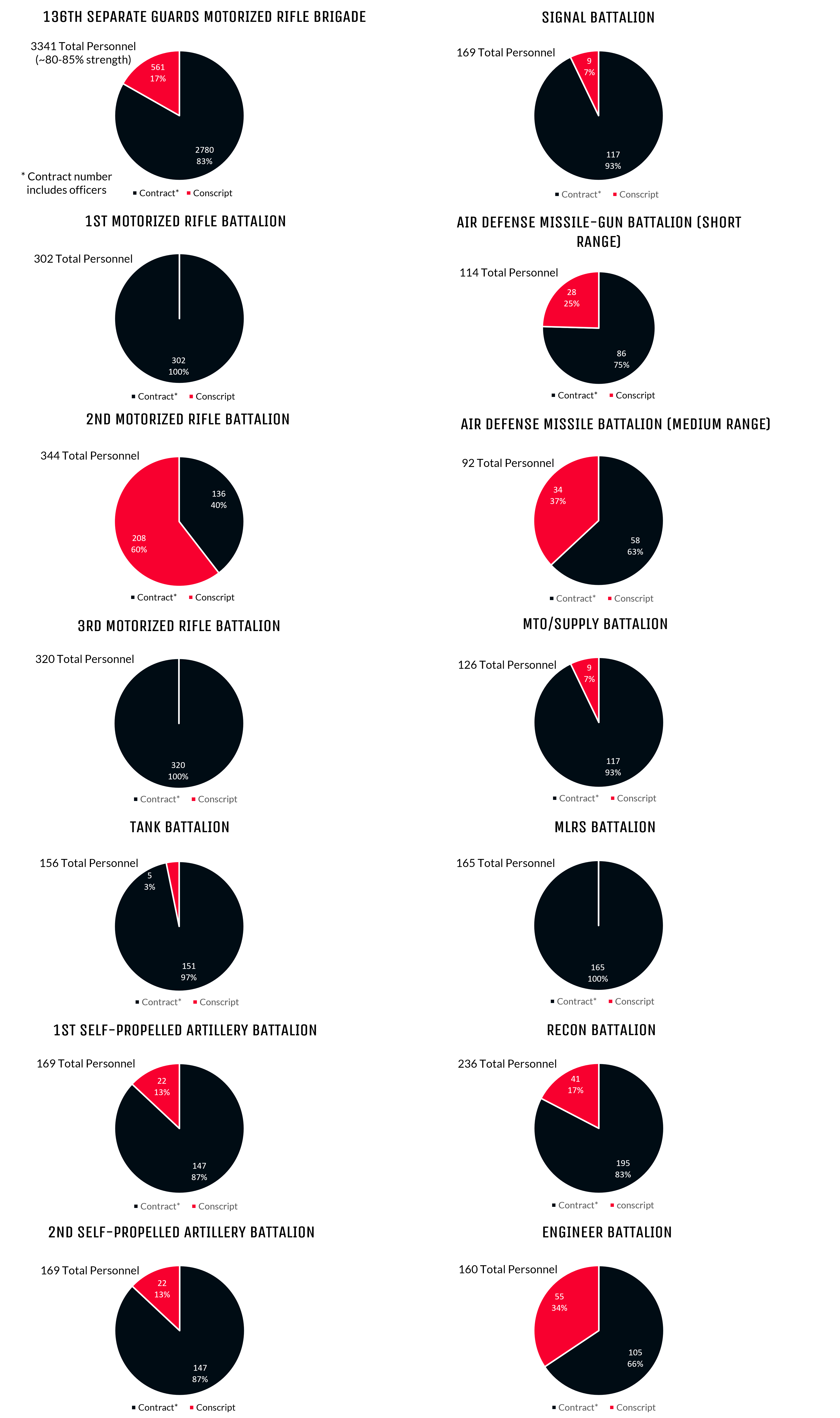 Because the Russian Aerospace Forces, Navy, and Strategic Missile Forces have a higher percentage of technical assignments, they receive a higher share of contract soldiers than the army. Within the Ground Forces, the priority is ensuring all NCOs are filled by contract soldiers as well as assignments like air defense, electronic warfare, and other equipment operators. Elite units like the airborne, naval infantry, spetsnaz, and reconnaissance units are also a higher priority for receiving contract soldiers. As a result, motorized rifle battalions don’t have enough contract privates, and it appears Russia decided to compensate by reducing the number of personnel in these battalions, instead of reducing the number of permanent readiness battalion tactical groups. It wasn’t just infantry soldiers. Russian maneuver units didn’t have enough contract privates to serve as drivers for logistics convoys and relied too heavily on conscripts. This meant they had a deficit of drivers once they invaded, which exacerbated their logistical problems.