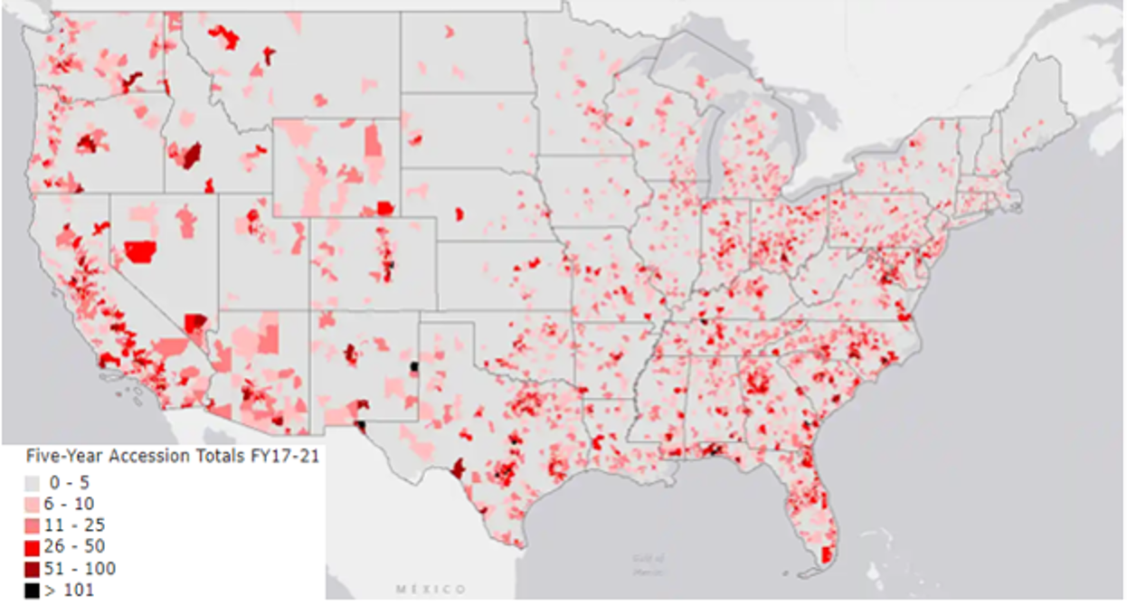 Air Force Recruiting Service enlisted accessions by zip code for fiscal years 2017–2021. (Graphic courtesy of Air Force Recruiting Service Public Affairs)