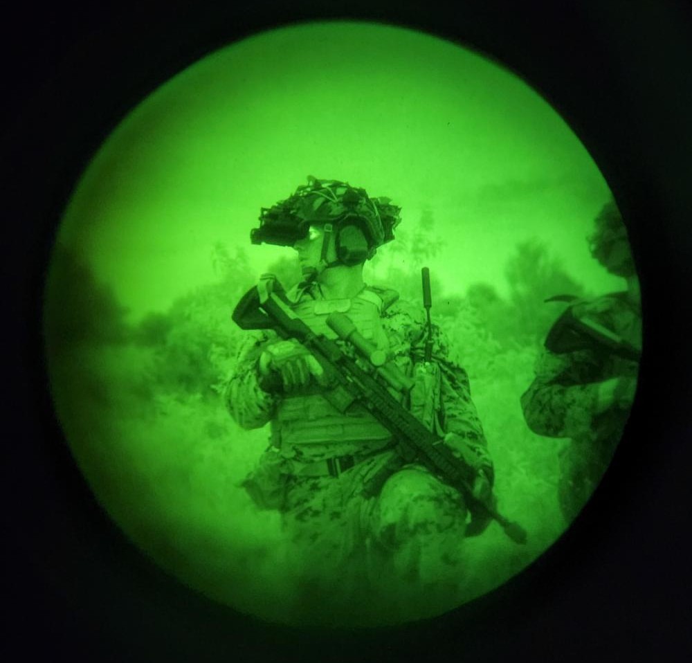 A marine with 1st Battalion, 2nd Marine Regiment, 2nd Marine Division, posts security during a night raid as part of a Marine Corps Combat Readiness Evaluation in June 2022. (U.S. Marine Corps photo by Cpl. Jennifer E. Reyes)