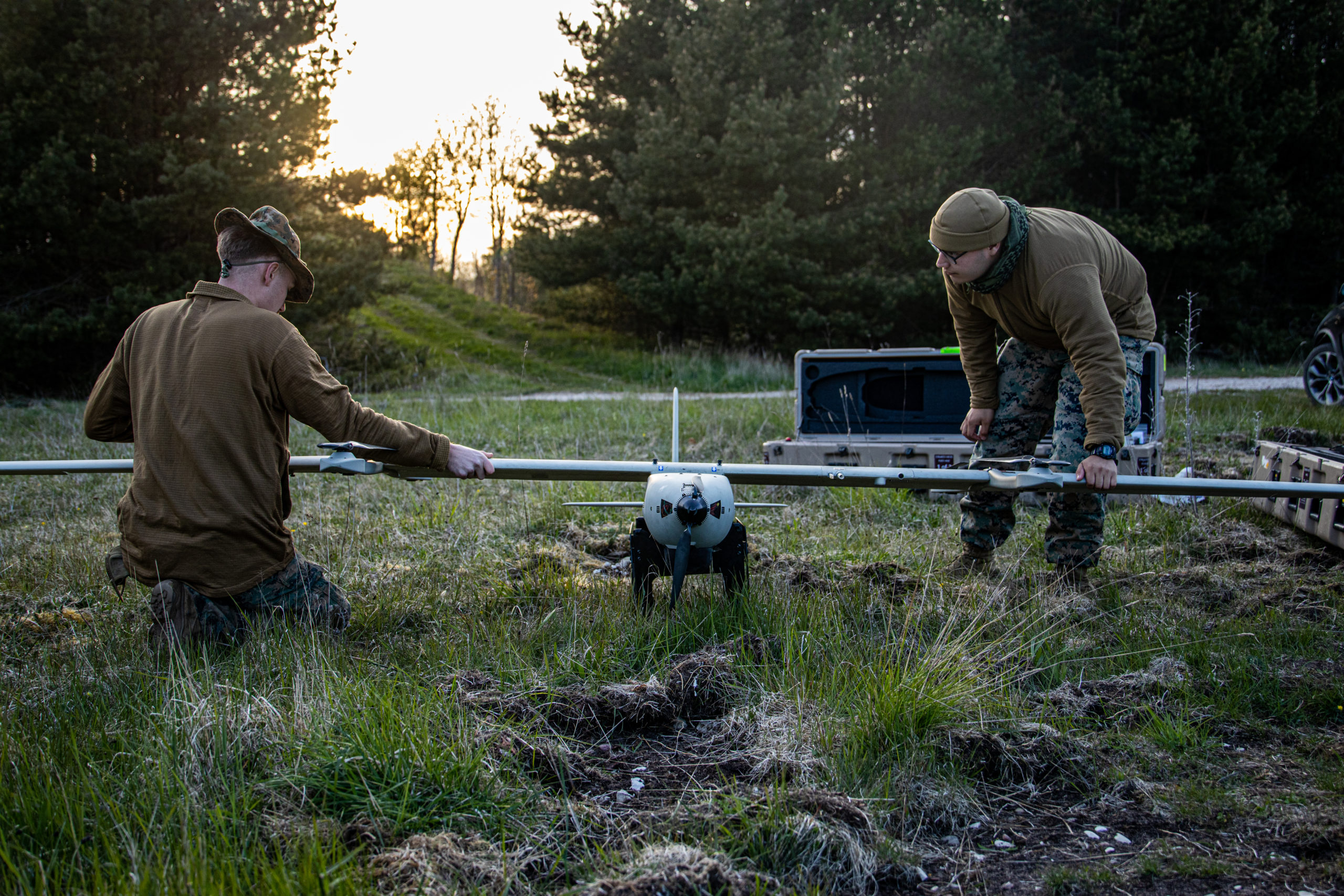 Task Force 61/2 marines preparing to launch an extended-range, vertical take-off and landing Stalker drone in Estonia. (U.S. Marine Corps photo by Sgt. Dylan Chagnon)