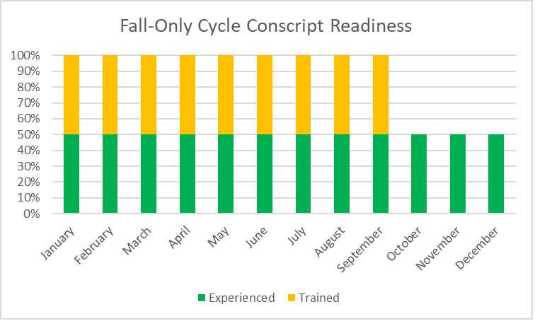 New PLA conscripts must undergo three months of basic training to become minimally trained and likely are not considered experienced until they take part in the PLA’s annual summer training season. Under the old once-a-year system, roughly 50 percent of the PLA’s conscripted force would qualify as “experienced” across the year. Between October and December, newly recruited conscripts were still undergoing basic training and thus could not contribute towards unit readiness. As such, for those three months, 50 percent of conscripts in the PLA were unable to support even basic combat operations. For the remaining nine months, those conscripts met minimum training requirements and only become experienced as the previous batch of conscripts cycled out of the force.