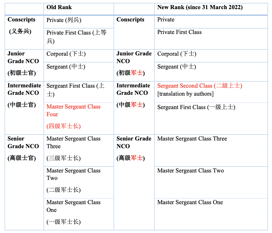 Given the importance that NCOs play in providing leadership and technical expertise, the PLA is continually seeking to improve the way in which it manages this portion of the force. In 2022, the PLA announced a series of changes to its NCO corps. It started with a name change in Chinese. NCOs are no longer called shi guan (士官), or “officer of soldiers,” a Chinese translation used for Western NCO systems, but rather jun shi (军士), a more traditional Chinese term for NCO. The names of the two NCO intermediate ranks also were changed in Chinese (to 一级上士 and 二级上士, presumably sergeant first class and sergeant second class), but no official English translation has been provided. The new names now parallel the form of the three senior NCO ranks (一级军士长, 二级军士长, 三级军士长), translated from highest to lowest as master sergeant class one, two, and three, which have been used since 2009. See table below.