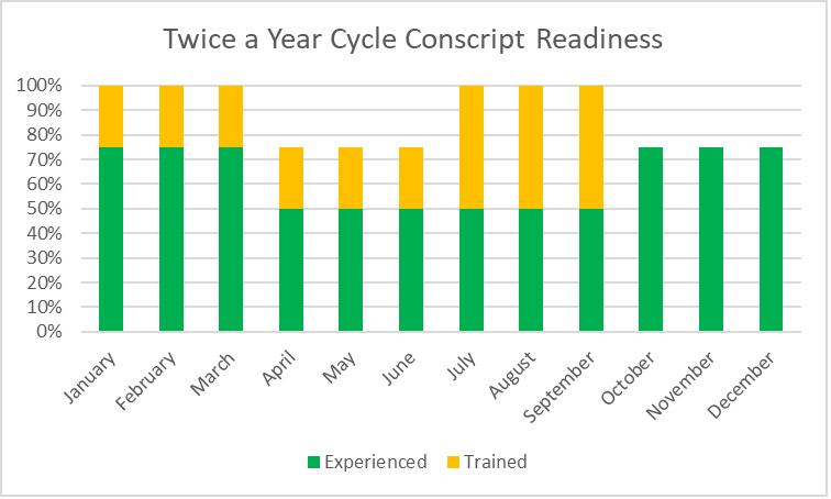 Under the new twice-a-year system, training schedules ensures that the PLA always has at least 75 percent of its conscripts at a minimally trained level and available.
