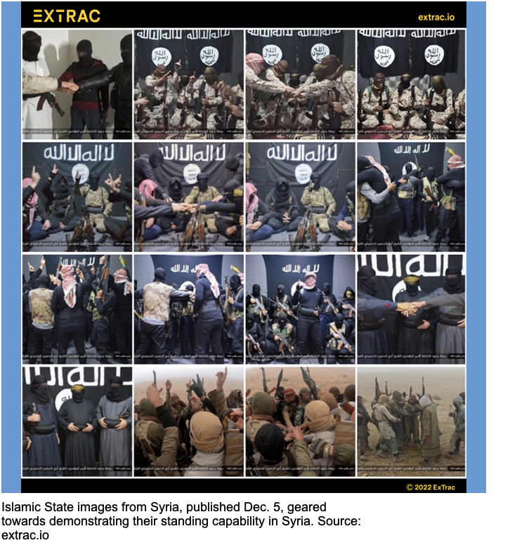 How realistic is this assessment? Recent official communications by the Islamic State’s media apparatus in Syria signal that it retains a substantial and moderately well-equipped network across eastern Homs, Raqqa, Deir Ezzor, and Hasakeh governorates, and potentially beyond. The images below, which emerged in early December, were distributed in part to demonstrate the enduring coherence of the Islamic State in Syria after the death of its leader in Daraa in October. They appeared at what could turn out to be a critical strategic juncture. In the absence of regular operations in the country, the Islamic State’s Media Diwan appears to be trying to signal the fact that it retains a developed standing force there, one that could be operationalized rapidly.