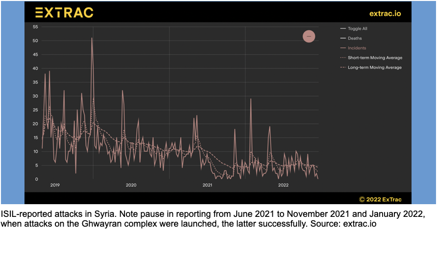 Perhaps unsurprisingly, Islamic State supporters in the region consider the degradation of the Syrian Democratic Forces to be a potentially transformative opportunity. Even the Islamic State’s own official reporting suggests its prospects in Syria have not looked all that good in recent months. The chart above shows the group reportedly conducting less than half as many operations across Syria each month in 2022 when compared with the first six months of 2021.While the Islamic State has been known to under-claim attacks, especially in the Syrian theater, its official reporting nonetheless represents an important reflection of its own perceived strength. On that basis, anything that could spell a change in trajectory for the latent “caliphate” in Syria is bound to create a stir among its members.