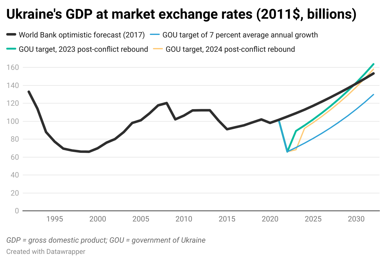 If next year or in 2024 Ukraine experiences a growth rebound typical of other post-conflict countries and thereafter meets government targets, the results would exceed the more optimistic pre-war forecasts, including those from the World Bank and its partners at the Ministry of Economy, Ministry of Finance, and National Bank of Ukraine in 2017. In this case, the war would prove to be an opportunity for both democratic and economic renewal.
