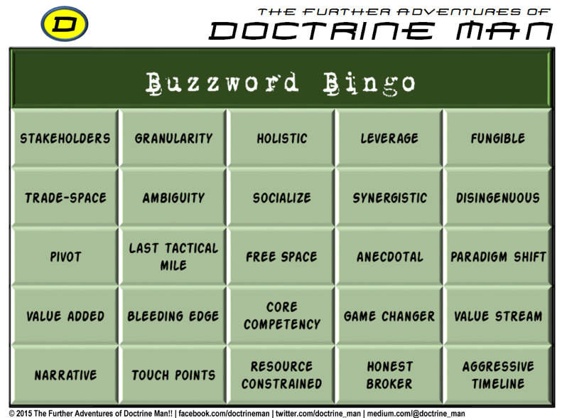 Organizations also tend to incorporate as many buzzwords as possible, even if it leads to incoherence. The result is exercises “focused on fires interoperability designed to increase readiness, lethality and interoperability across the human, procedural, and technical domains.” This communal regurgitation of buzzwords was described by a retired military officer I interviewed as “bunnies reproducing on PowerPoints.” Historically and not only in the military, when buzzwords are regurgitated, people keep track. It is not uncommon for individuals to create bingo cards of that moment’s terminology and turn speeches, presentations, or conferences into games of buzzword bingo with their colleagues.
