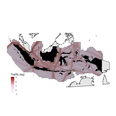 Pirate attacks require targets. We accounted for targets by including the yearly vessel traffic density from the Automatic Identification System data. As shown in the figure below, vessel traffic is not uniform across the Indonesian maritime space.