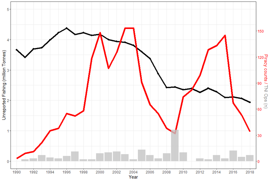 As shown in the figure below, illegal fishing in Indonesia has generally declined since the 1990s, largely due to better enforcement, but pirate attacks have increased and decreased significantly at different times depending on macro-economic and political factors.
