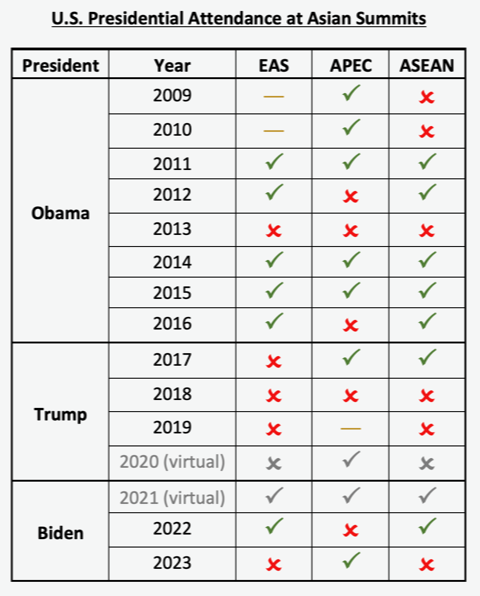 President Obama made it a point to attend the yearly Asian summits, going to 15 of 22 (68 percent) of the in-person meetings and skipping them entirely in only one of his eight years. President Trump only made it to two of eight (25 percent) in-person summits. Many expected that Biden would mark a return to Obama’s approach, but he will have gone to only three of six meetings in person. And the United States hosts the Asia-Pacific Forum this year, so he hardly gets credit for attending.