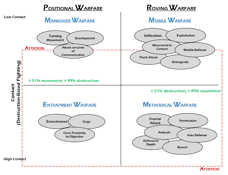 In other publications, scholars have provided an alternative framework for defining the mechanics of armed conflict. In this framework for warfare (see figure 1), contact serves as the X-axis and movement serves as the Y-axis. Contact (i.e., direct engagement with an adversary) is rated from heavy to light. Movement (i.e., the ability to use or the actual use of movement more than firepower) is also rated from heavy to light. The process of comparing movement and contact from heavy to light along each of those variables yields two primary forms of warfare — positional and roving warfare. Two subordinate forms of warfare exist beneath positional and roving warfare. Attrition, for its part, is not a form of warfare. Rather, attrition is a descriptor used to highlight armed conflicts, campaigns, battles, or engagements in which destruction-based warfighting is high, and at least one side in the conflict is inflicting significant casualties on the other.