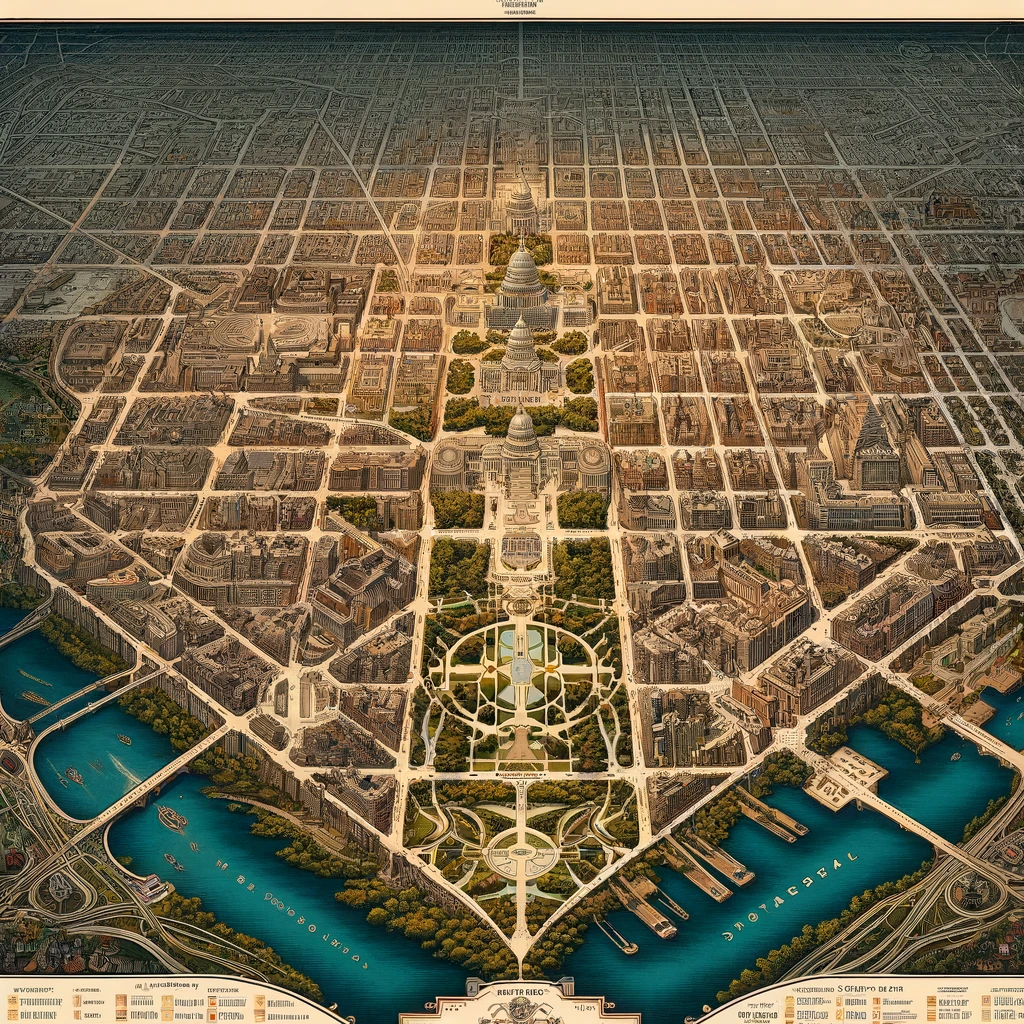 Let’s start here at home. In response to the prompt: “show me a historic map of Washington,” ChatGPT came up with this beautiful bastardization of L’Enfant’s vision. There is, undeniably, something spot on about the vibe. The National Mall has been redone in the style of a French garden, but the city’s overall grid pattern and diamond shape are there. The buildings in the foreground are all appropriately bureaucratic and the loops of highway over in Arlington are appropriately convoluted. The first Capitol isn’t bad either. It’s just that there are three more behind it, all looking like rejected architectural drafts. The Anacostia River has been renamed the эπφtдcəcac, while the Potomac proudly defies transliteration. Indeed, trying to make out the words on AI-generated maps usually feels like taking an eye exam in Amharic while seeing double.