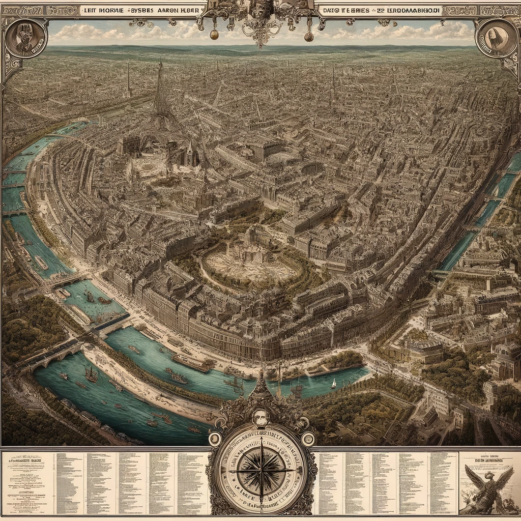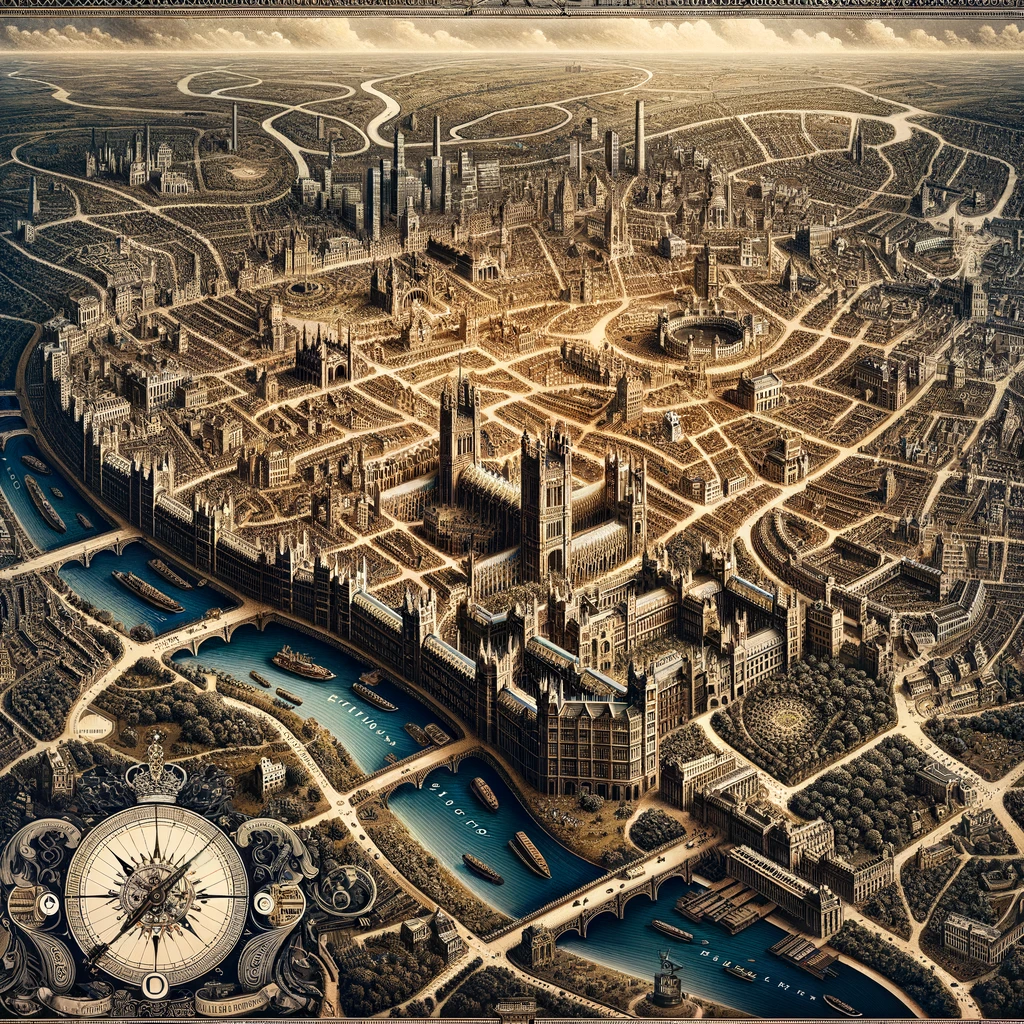With London and Paris, the atmosphere grows more menacing. Perhaps ChatGPT grew up reading Orwell, or just internalized a dark, 19th-century foreboding from too much Dickens and Hugo. London’s streets spiral out in a winding maze, while a long, unending building claustrophobically walls off the Thames. And for a final, infernal touch, the compass rose in the bottom left has been replaced with an indecipherable, crown-topped clock.