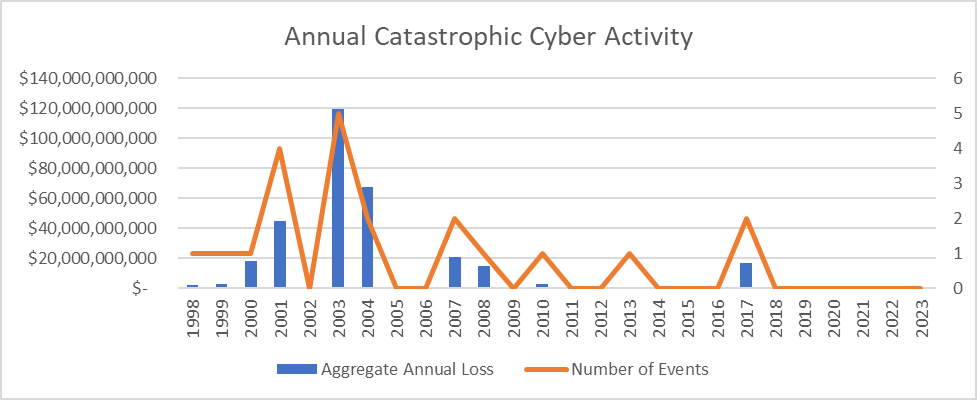 I found 21 cyber catastrophe events since 1998 with attendant economic losses adding up to a total of $310.4 billion. The reporting standard I’ve employed isn’t as severe as Lewis’ in that it doesn’t require mass injury or physical damage. It does, however, require mass impact. An attack on a single company, like Equifax, isn’t a catastrophe, even if the economic loss is comfortably above the threshold. In Property Claim Services (PCS) parlance, an event would have to affect a “significant number” of companies. Finally, the economic threshold for an event to qualify is $800 million, adjusted to 2023 for inflation at 3 percent per year.