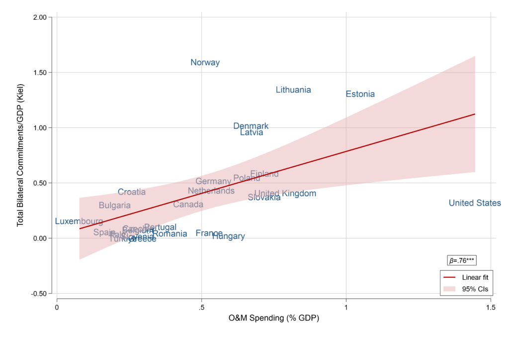 Figure 1: Operating and Maintenance Spending as a Share of Gross Domestic Product and Total Bilateral Commitments to Ukraine as a Share of Gross Domestic Product, 2022–-2023 (Source: Lanoszka and Becker, 2023)