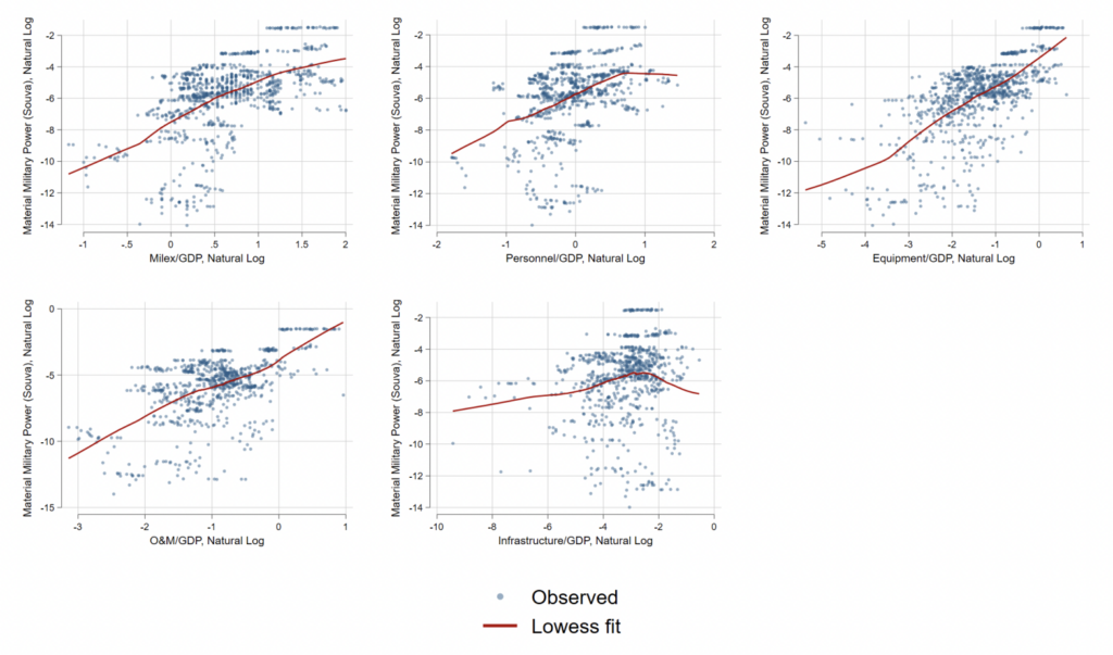 Third, what figure 2 demonstrates is that material military power, defined by Mark Souva as “major naval, air and land weapons as well as nuclear weapons and ballistic missile capability,” is very well predicted by defense spending of all types, but particularly by topline defense spending as a share of gross domestic product (NATO’s 2 percent metric).