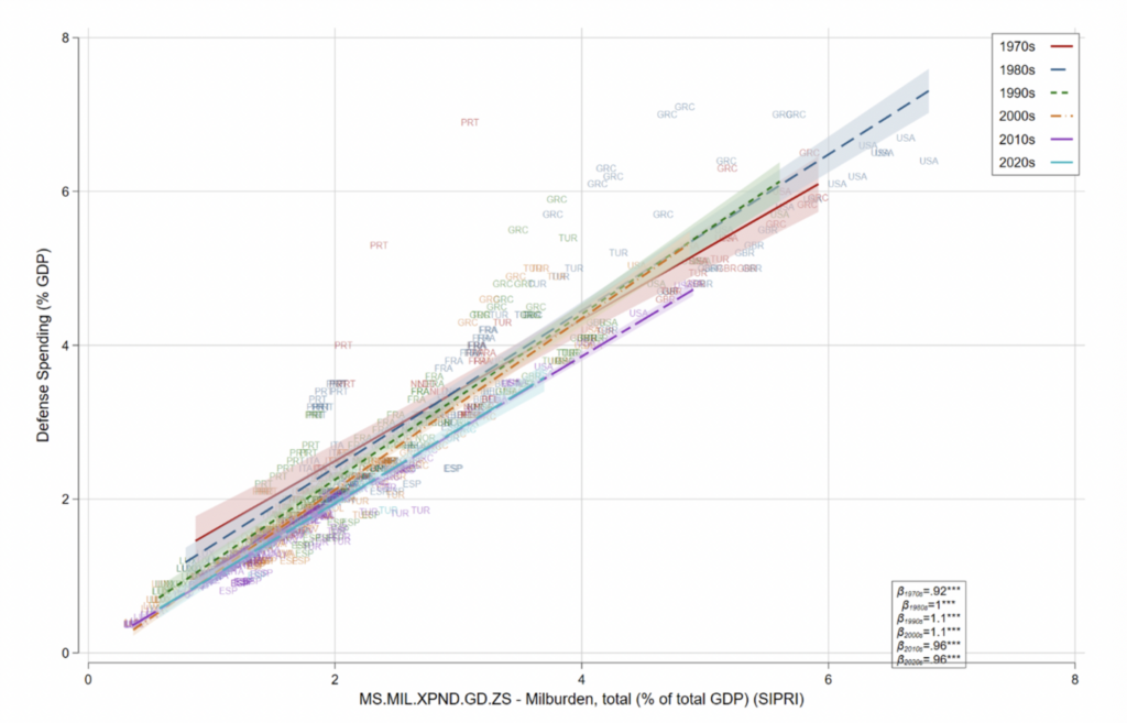 Figure 3 shows how tightly and consistently correlated NATO’s and SIPRI’s defense spending figures have been across the decades. For each year and each country, SIPRI’s figures are on the X axis and NATO’s on the Y axis. For each decade, the regression coefficient is essentially 1, meaning the figures are nearly the same, with most observations tightly clustered along upward sloping lines with slopes of about 1.