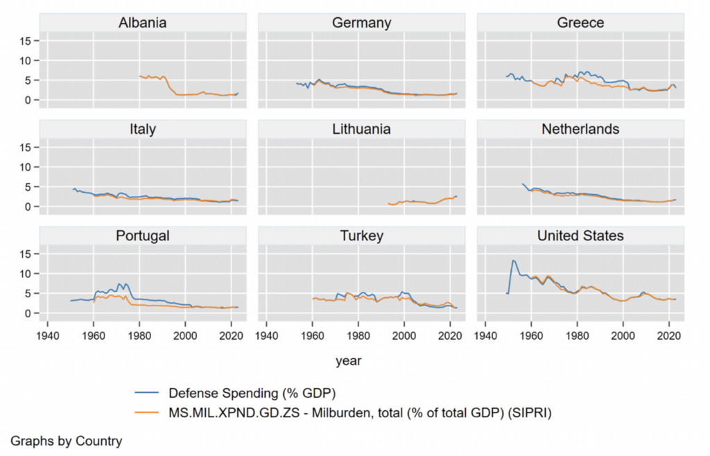 Figure 4: NATO and SIPRI Defense Spending Data, by Country: Albania, Germany, Greece, Italy, Lithuania, Netherlands, Portugal, Turkey, United States (Source: Authors, based on SIPRI and NATO data